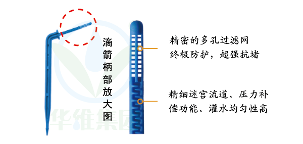 白色滴箭配白色毛管,與1828壓力補償滴頭的“單箭+單滴頭”的組合,灌溉施肥流量更加精準、均勻性更好,多用于設施農業,加長的柄部長約15cm,可防止根系生長堵塞出水口,插入松軟基質的固定效果也更好。